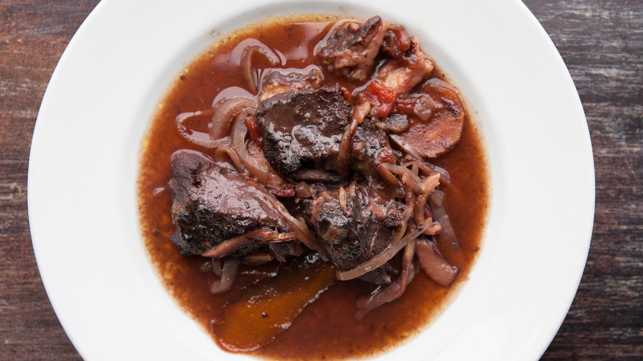 Voir les super offres. 1 cup dry red wine. In a large pan or skillet saute the bacon over medium heat in 1 tablespoon of oil for about 3 minutes until crisp and browned. 1 ½ tablespoons all-purpose flour. Marmiton mag Et si vous vous abonniez. Once done put the beef on the side and add the chopped red onion chopped carrot and chopped celery these veggies will be discarded in the end. Marinated or Spice rub. Add the seasonings except for the black pepper tomato paste ground dried porcini mushrooms and return the bacon and beef to the pot.