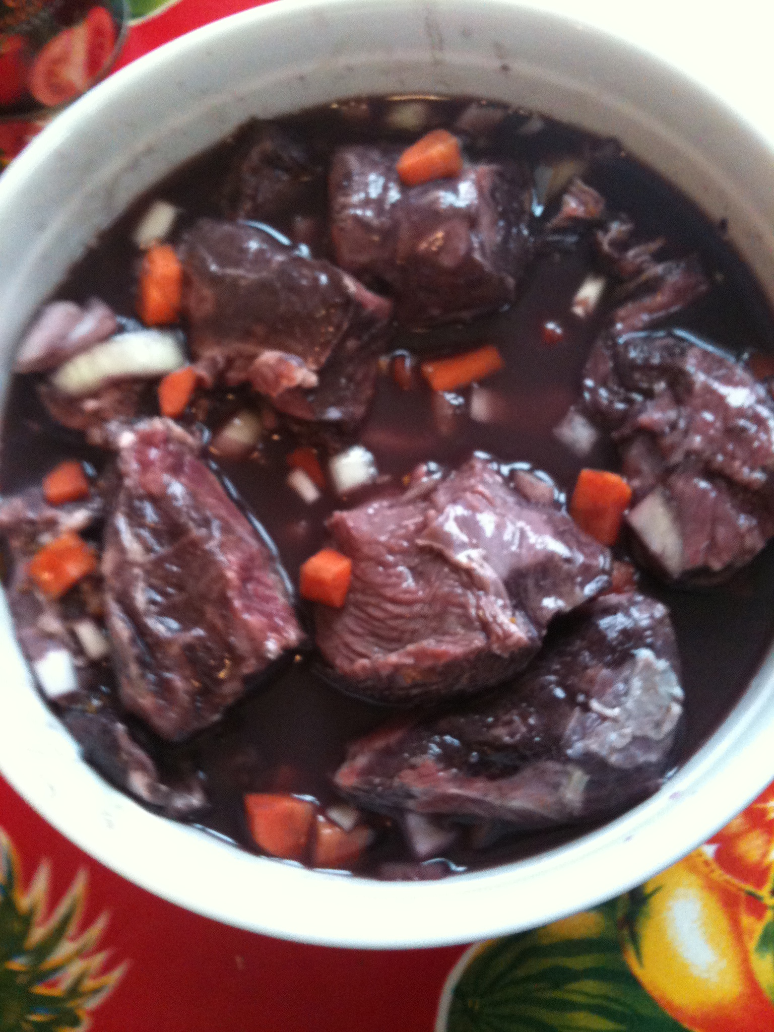 Dans 1 récipient mettez la viande les dés de carotte et doignon les zestes dorange et le bouquet garni.